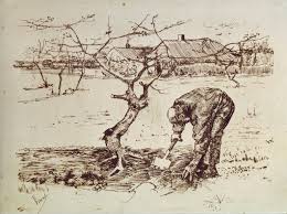 Vincent van Gogh: Las granjas, los agricultores, jardinero cerca de un retorcido árbol |